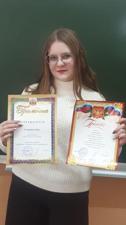 Усманова Анна, ученица 9в класса, является председателем Совета старшеклассников школы, экскурсовод школьного музея боевой славы, принимает активное участие во всех общешкольных мероприятиях и помогает готовиться к районным мероприятиям (снимает и монтирует видеоролики).