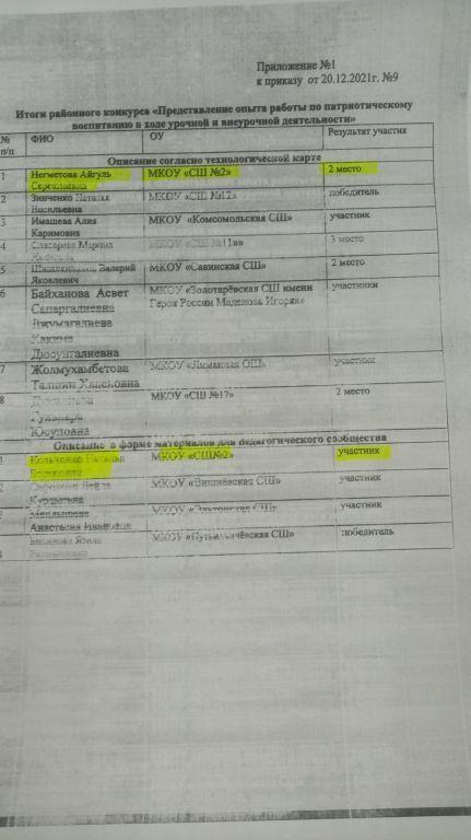 Призёром районного конкурса "Представление опыта работы по патриотическому воспитанию в ходе урочной и внеурочной деятельности" стала учитель истории и обществознания Негметова А.С. (II место). Учитель математики Кольченко Н.Б. выступила в номинации "Описание в форме материалов для педагогического сообщества" (участник конкурса).