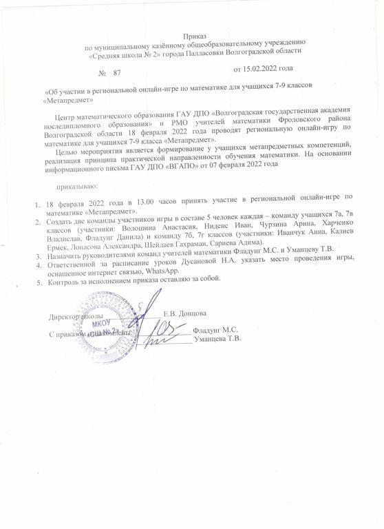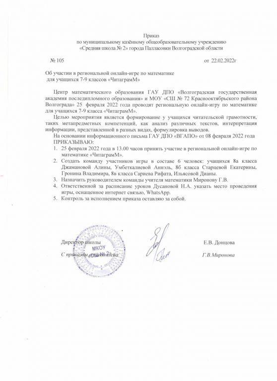 Приказ № 105 от 22.02.2022 «Об участии в региональной онлайн-игре по математике для учащихся 7-9 классов «ЧитаграмМ».
