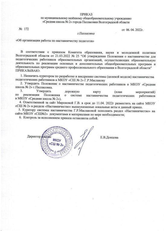 Приказ №172 от 06.04.2022 года «Об организации работы по наставничеству педагогов»