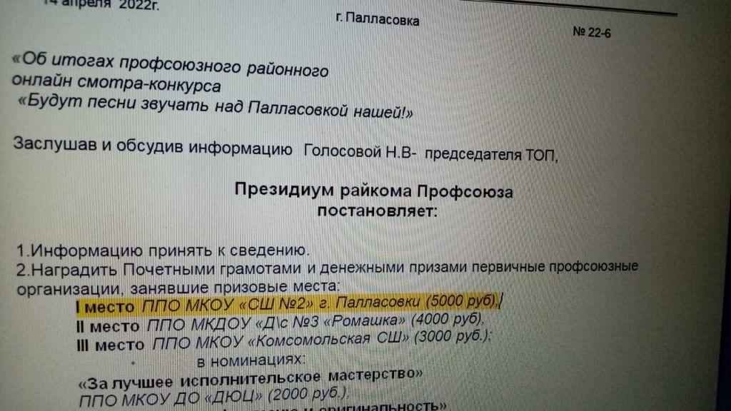Коллектив МКОУ "СШ №2"принял активное участие в онлайн смотре - конкурсе хоров "И будет песня звучать над Палласовкой нашей" и занял I место.